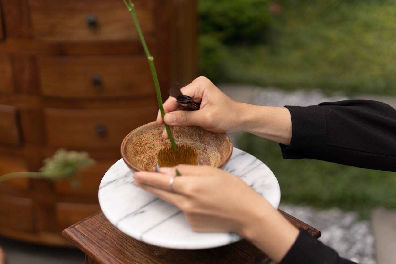 在課堂裡,學員將以劍山進行插作桌花,透過「茶 × 花」的對照, 體驗香氣、色澤與線條之間的平衡,學習如何以感官語言書寫一件花藝作品。