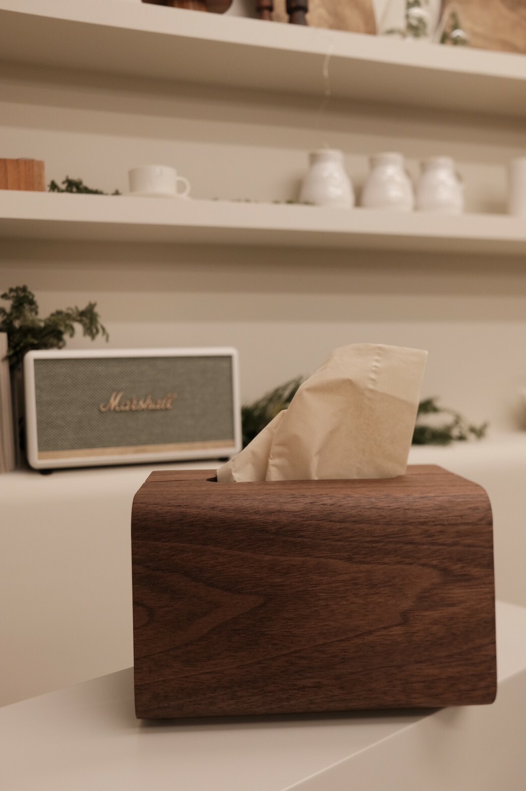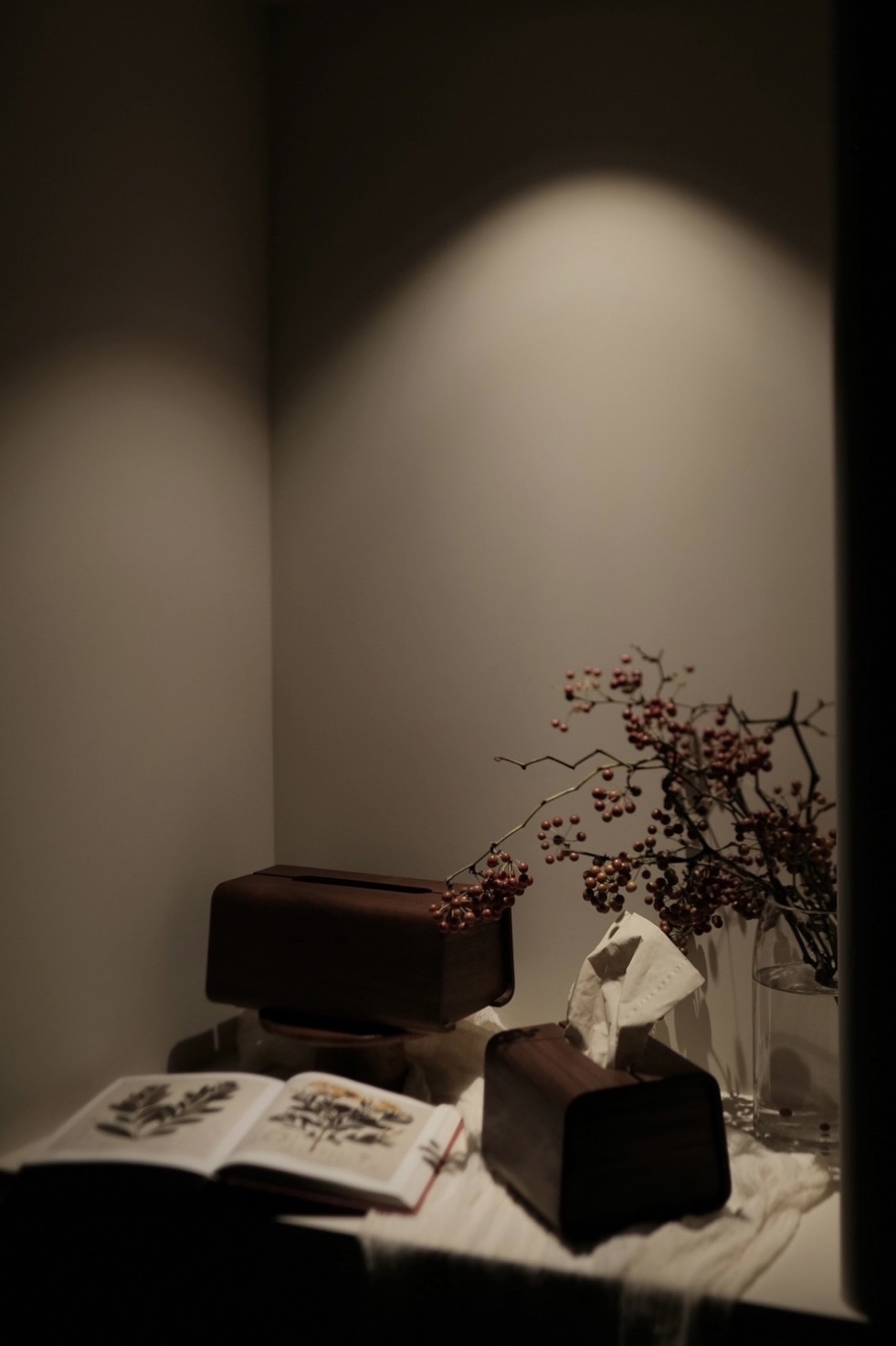 有別於傳統面紙盒的立體外型,以簡單的結構建構出簡約造型,搭配表面的腰形開孔,像是從樹縫中抽出一張紙來。